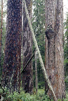 Satojen vuosien ikäisiä keloja. Huomaa metsäpalojen jäljet.