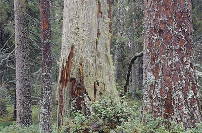 300-500-vuotiaita aihkimäntyjä, naavaa ja jäkäliä. Monimuotoisuutta.